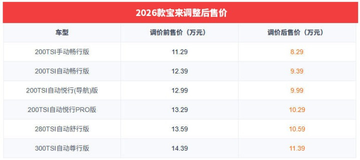 具体来看,近日一汽-各人官方公布,2026款各人宝来开启调价(即官降),新车价钱从原先的11.29-14.39万元(2025款车型售价)调治至8.29-11.39万元,调价幅度为3万元。