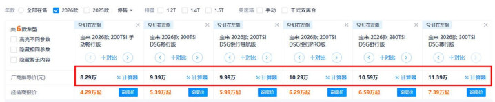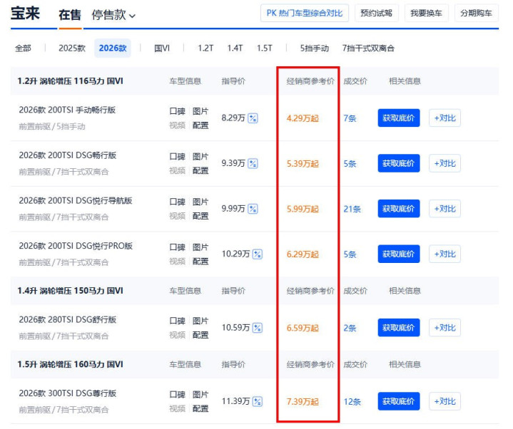 据咱们从主流汽车网站某某之家上所了解到的信息来看,当今2026款各人宝来全系在新的联结价基础上还能优惠4万。也等于说,8.29万元的宝来2026款 200TSI 手动畅行版,脚下在结尾只需4.29万元的价钱便能够买,那这可确切实打实地低廉了很多。