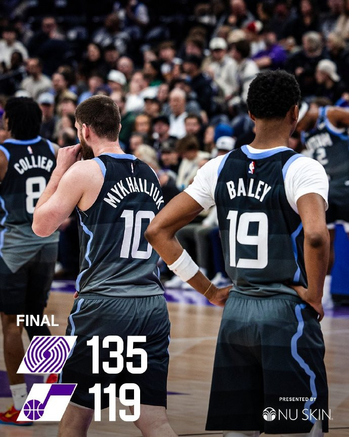 爵士这边,马尔卡宁、小杰克逊、基昂特-乔治、努尔基奇等齐莫得出战,全队也有6东说念主得分上双。森萨博弘扬出色,首发出场36分钟,19投8中,三分球11中5,罚球9中7,空砍28分4篮板,正负值-27。