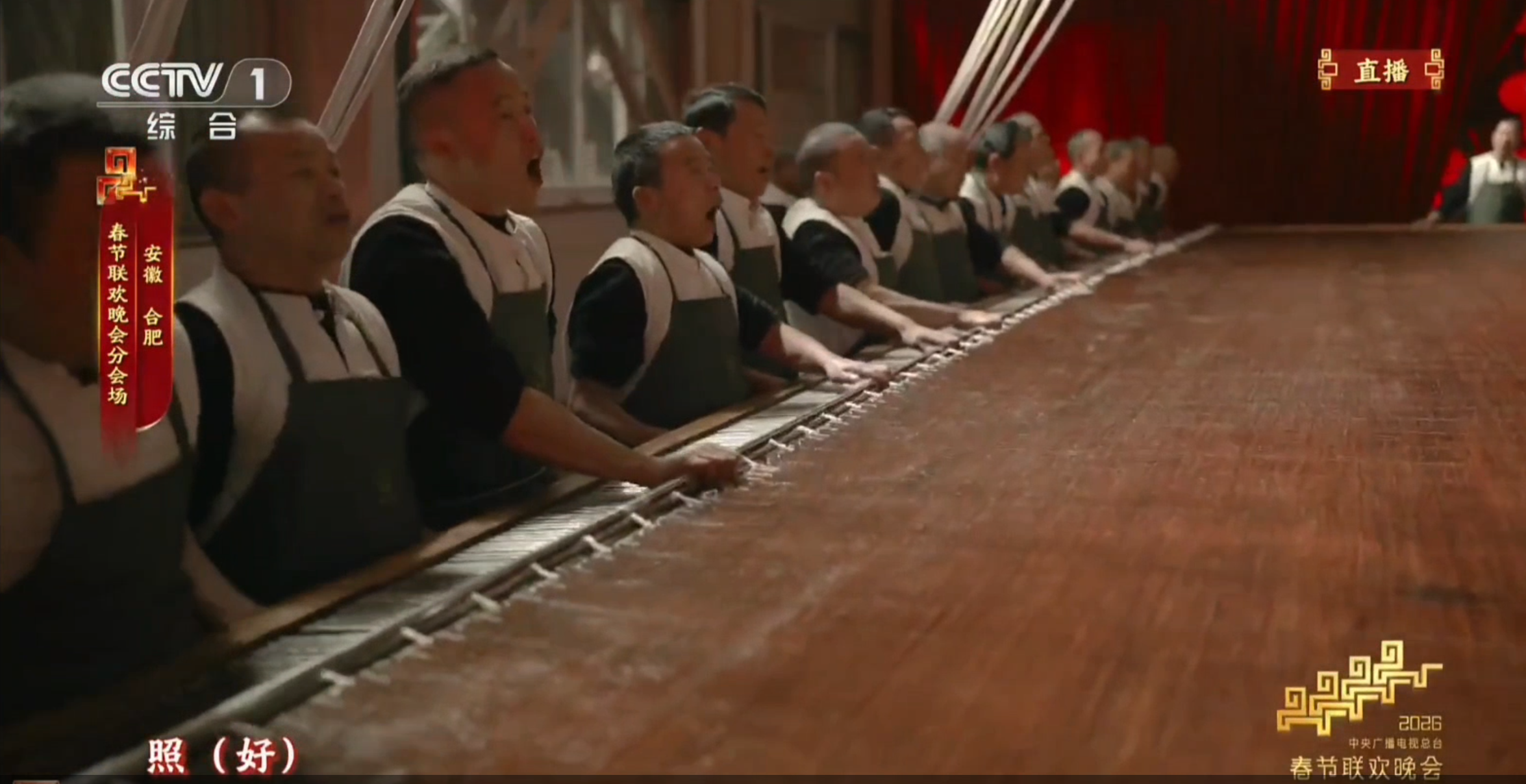 第一次是在跨年倒计不息代段,安徽合肥分会场的画面里,捞纸工东说念主们在捞纸进程中,整王人齐截地喊出了“照”的标语,用安徽方言展现东说念主类非物资文化遗产的魔力。