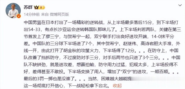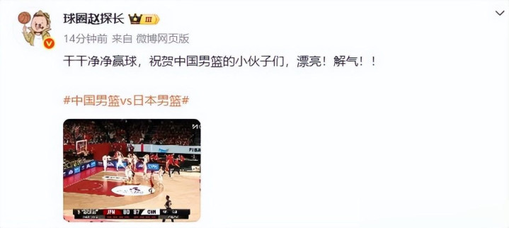 赛后望望专科媒体东谈主苏群、赵探长奈何说,苏群暗示:“中国男篮在日本打出了一场精彩的逆转战,下半场变换了用东谈主,加多了双宁的紧迫,一顺百顺。。。”