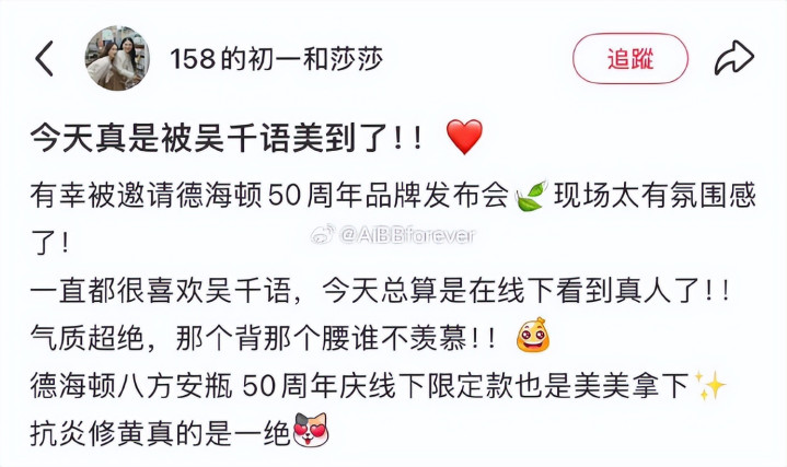 4.14日,多位网友偶遇了在上海出席50周年活动的吴千语,纷繁上传相片力证她有颜有躯壳,气质超好。