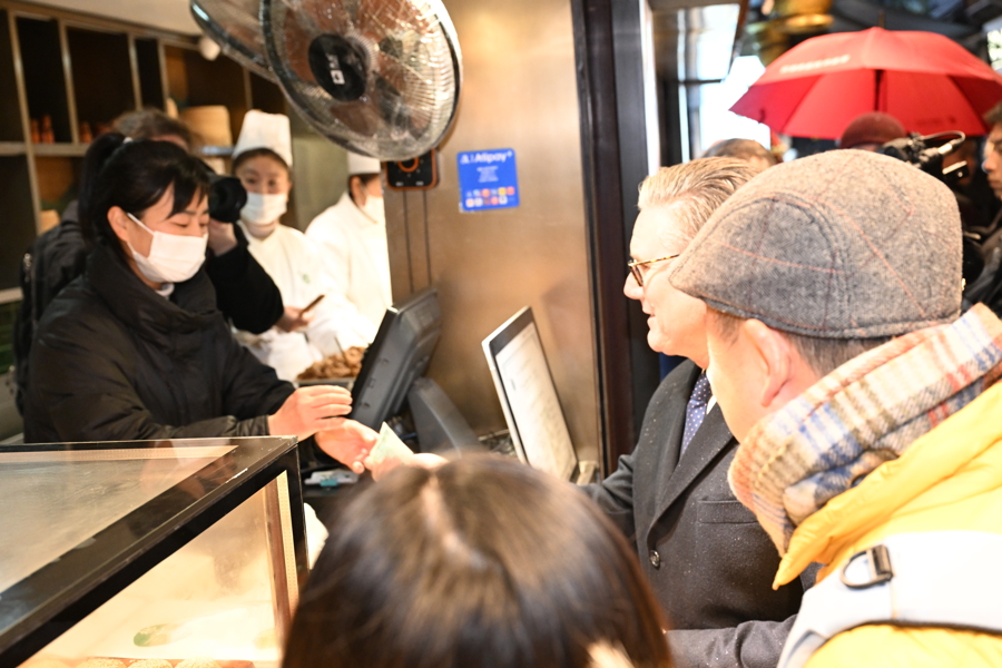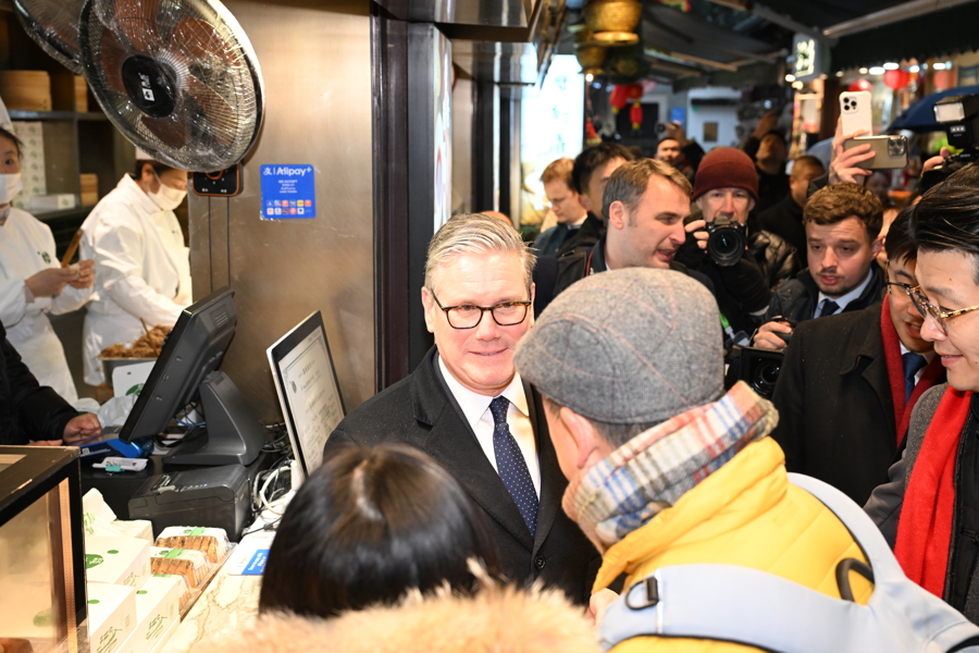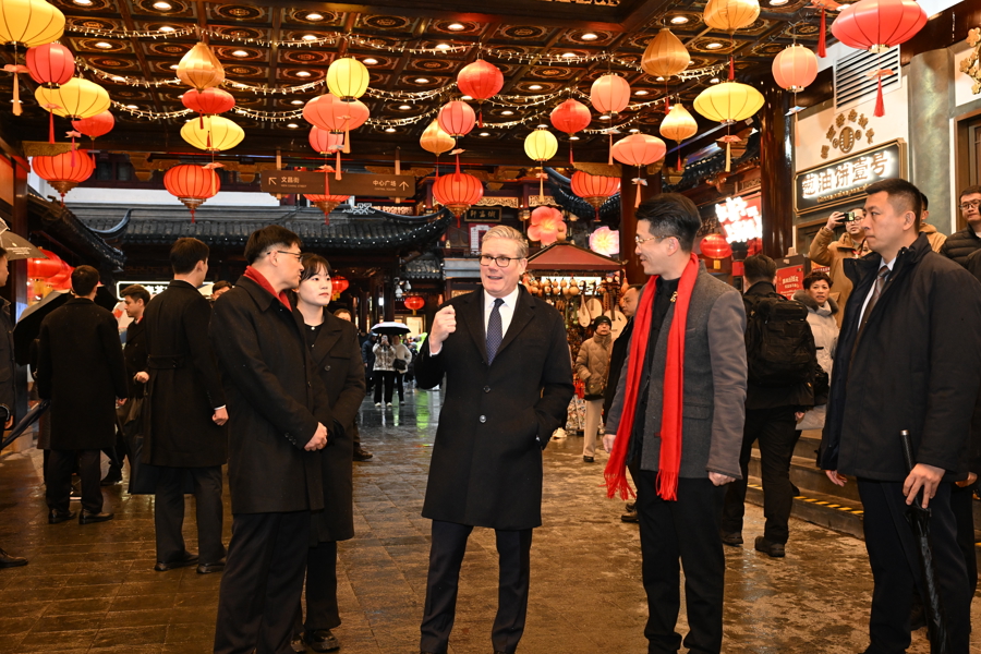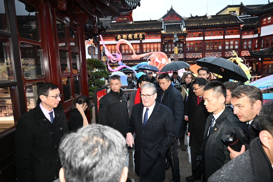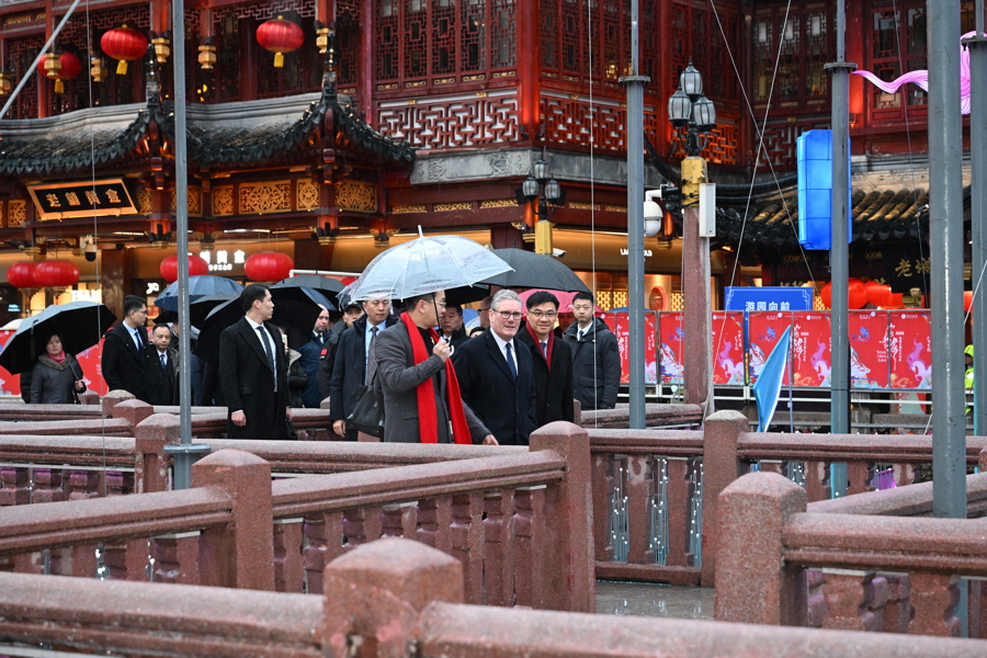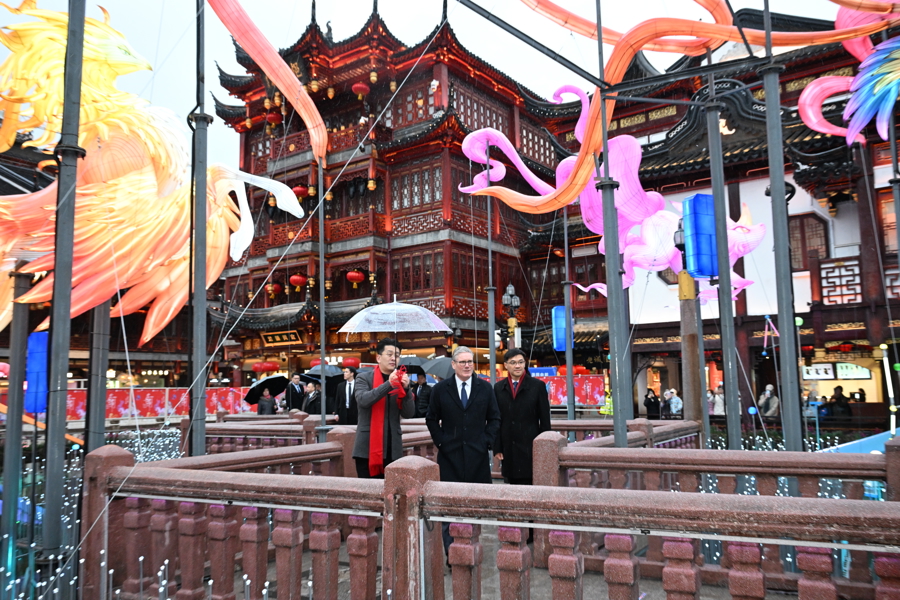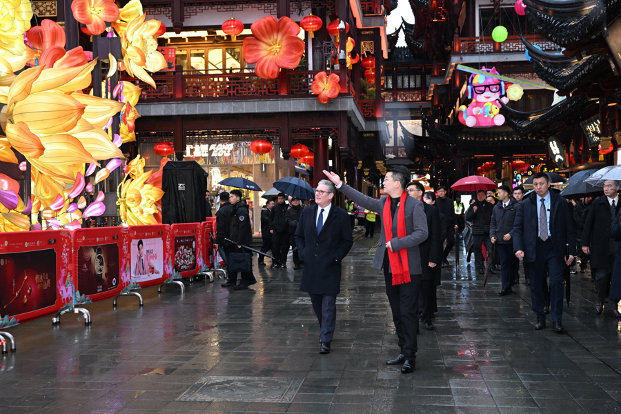 1月30日下昼,太空下着细雨,英国首相斯塔默一转来到豫园,逛九曲桥,进湖心亭,与市民同样,感受中国传统文化。