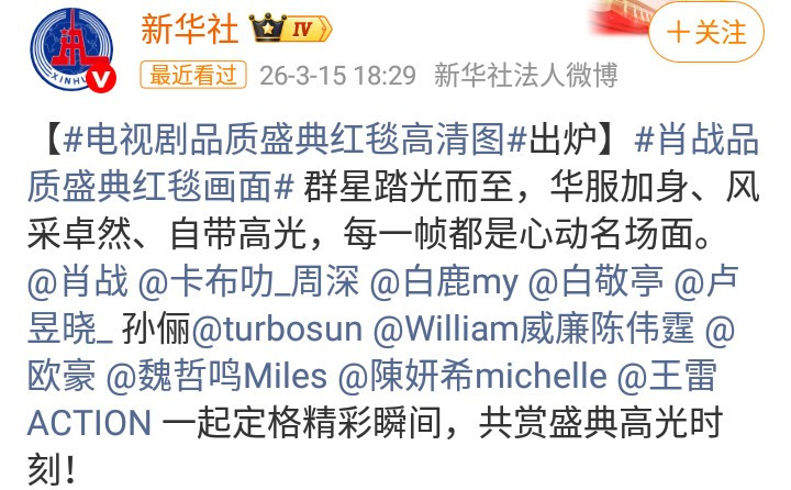 新华社3月15日发文:提到了肖战、周深、白鹿、白敬亭、陈伟霆、欧豪、魏哲鸣、陈妍希等明星艺东谈主的名字! 新华社如是好评:群星踏光而至,华服加身、风采卓然、自带高光,每一帧齐是心动名阵势。好意思好形象,优秀发扬,精彩短暂,无缺阐明,才是明星艺东谈主好意思好的方法!