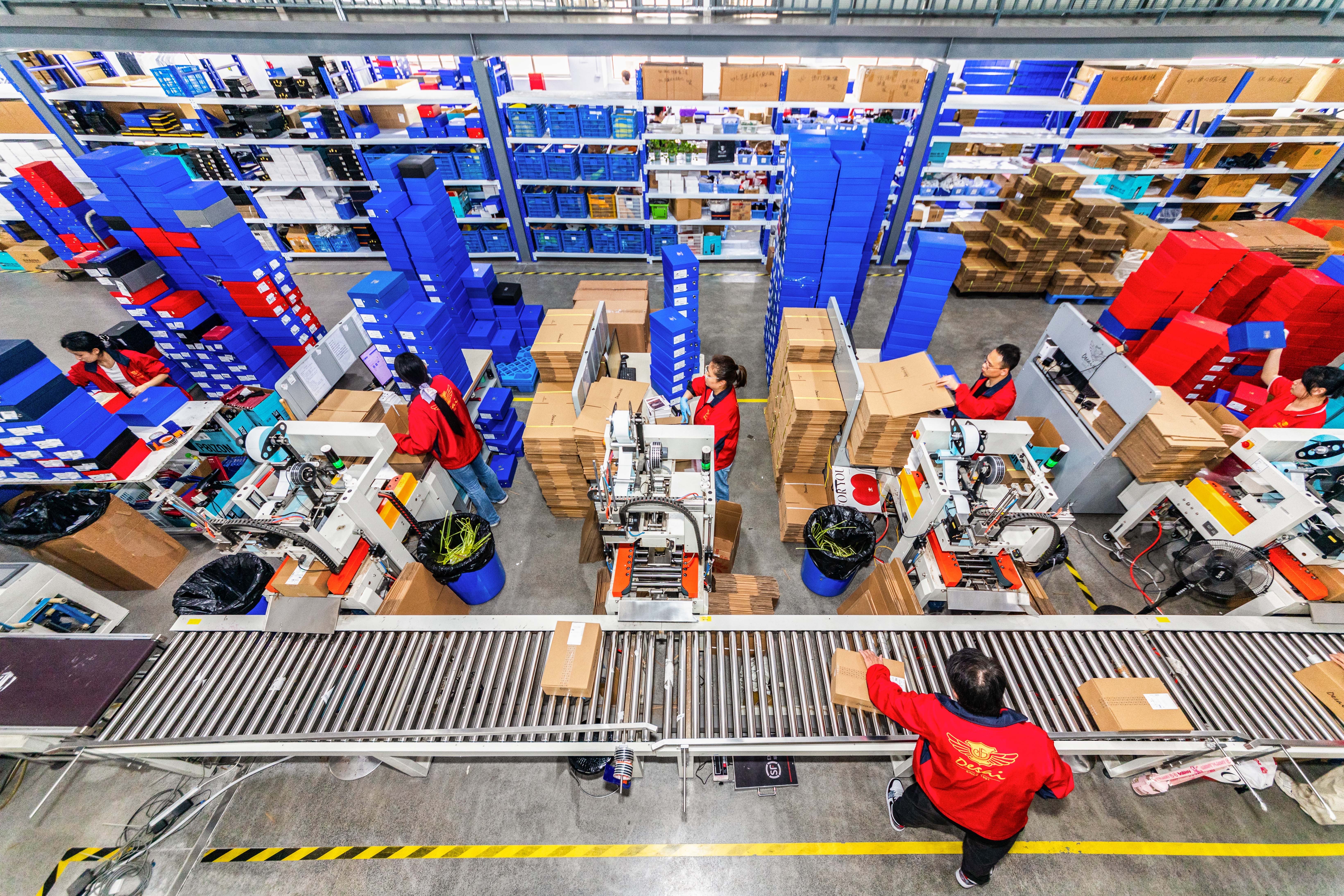 2025年4月,在位于浙江省温州市的德赛集团物流园内,责任主谈主员在对发货鞋类产物进行分拣、打包。新华社发(刘祯祥摄)