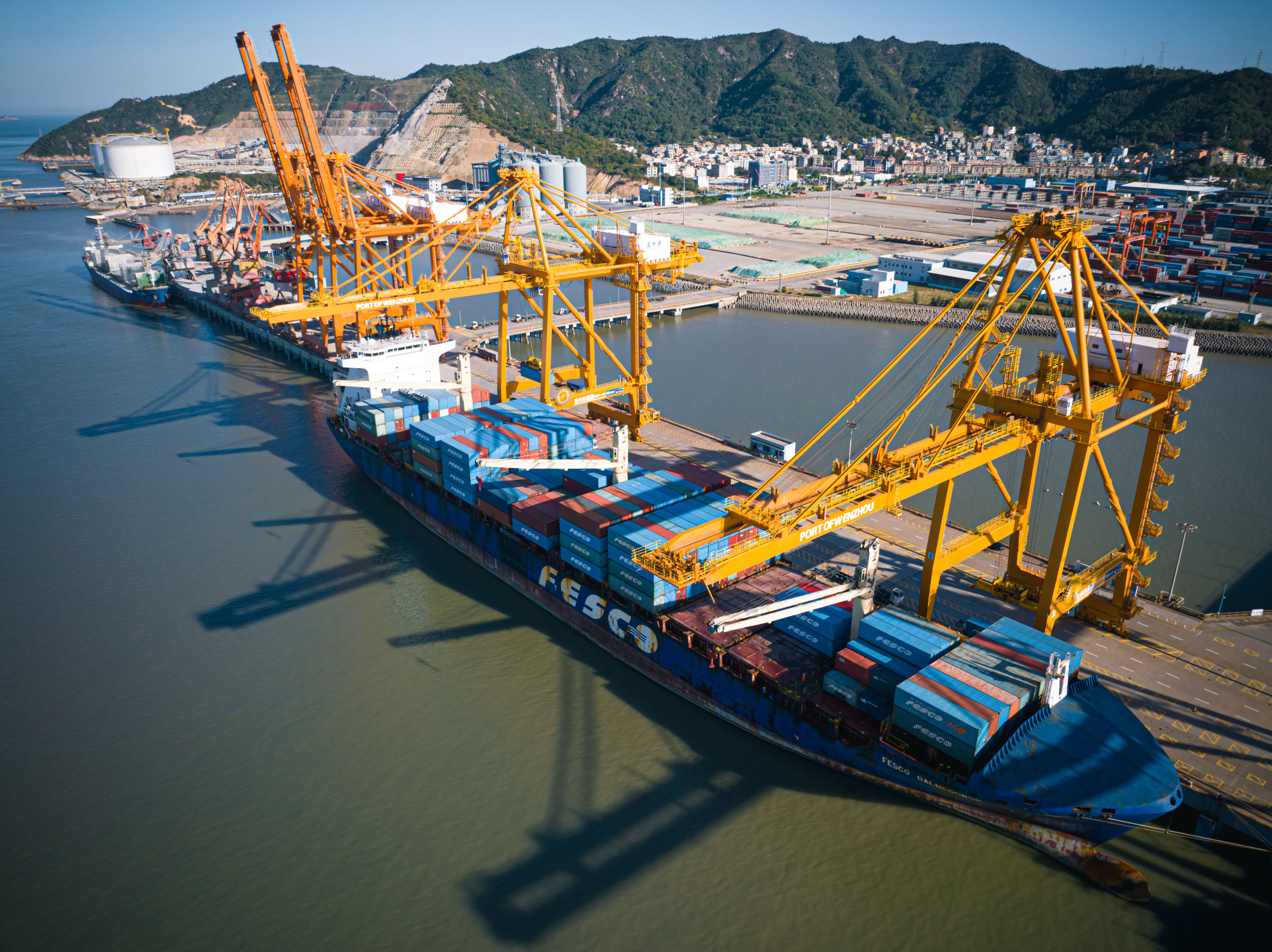 货轮停泊在温州港状元岙集装箱船埠卸载集装箱(无东谈主机像片,2023年11月22日摄)。新华社记者 江汉 摄