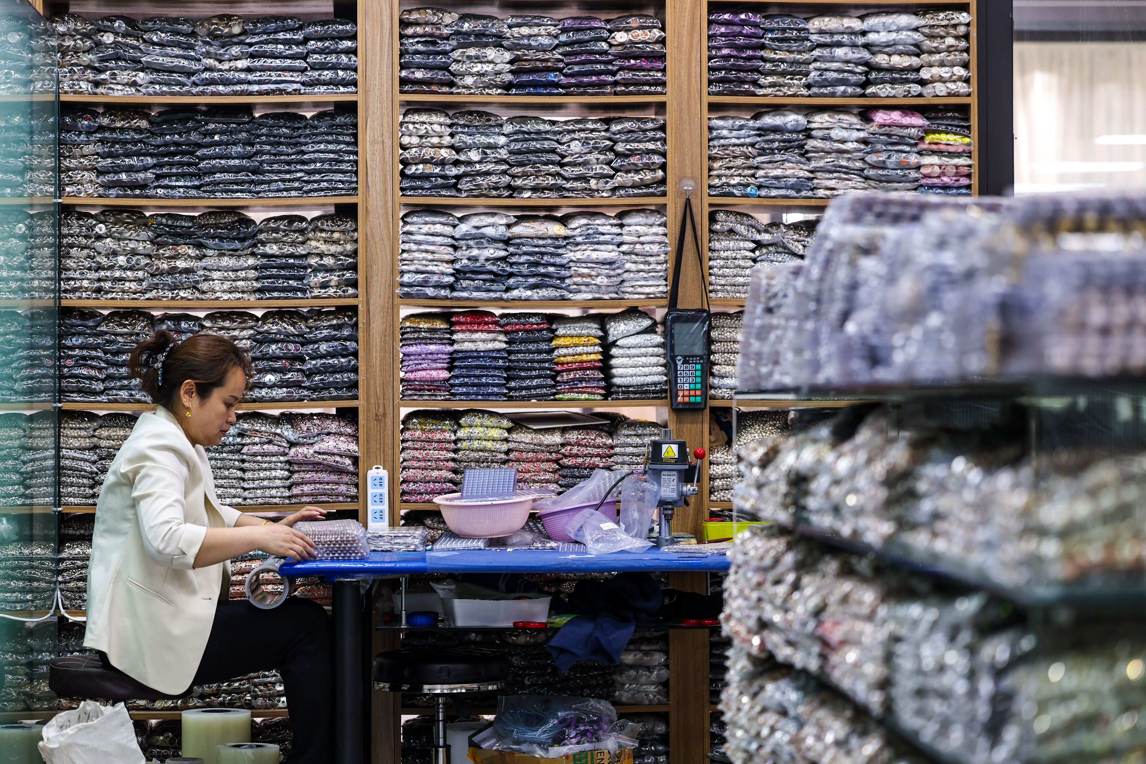 2025年3月,在温州永嘉县桥头商贸中心一家计较钮扣产物的店铺内,职工在打包钮扣产物。新华社记者 江汉 摄