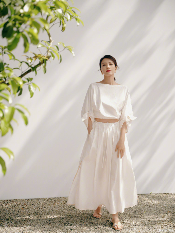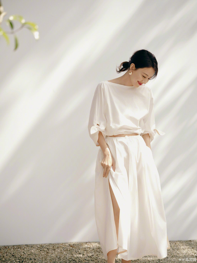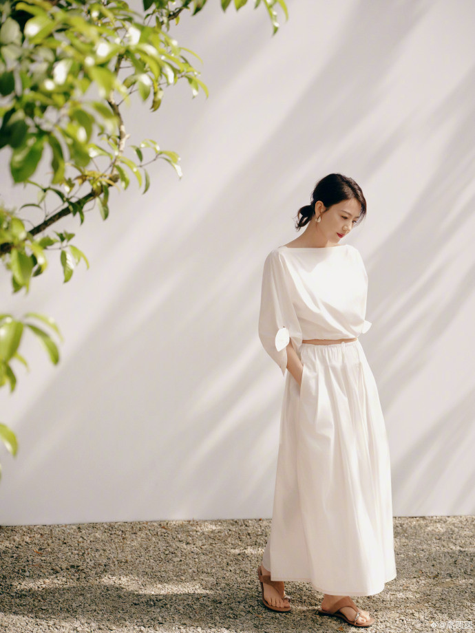 裙装以皑皑的米白为主调,廓形宽松的短款上衣,带着慵懒的一字领与袖口系带策划,即兴又不恶浊。搭配同色系高腰大摆半裙,恰到平允的露腰剪裁,在宽松版型中偷偷勾画出腰线,幸免了痴肥感,也让举座比例更显舒展。看似简便的两件套,实则藏着 “松紧均衡” 的穿搭巧想:上宽下也宽,却靠短款上衣和高腰线打造出了利落的分割感,全齐是不忙碌就赢很大的浮松感。