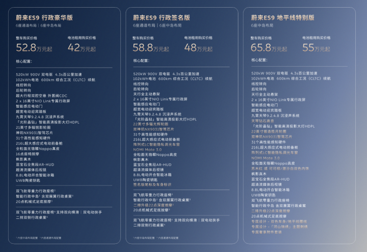 而此次的 ES9 起售价毫无疑问是再续了此前的惊喜,ES9 租电版预售价最低 42 万元,买断价钱也只需要 52.8 万元。而带有天行主动吊挂的行政签名版价钱分散是租电 48 万元和买断 58.8 万元。